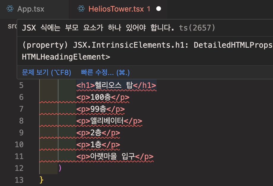 이때 각각의 리액트 컴포넌트는 여러 요소를 그대로 반환할 수 없으며, 그렇기에 하나의 부모 요소로 묶어주어야 합니다.