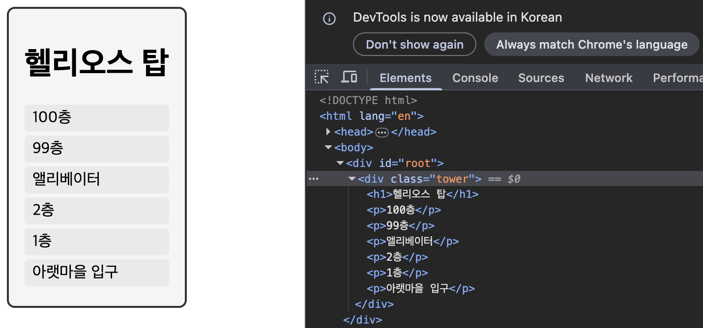 오른쪽은 축약 문법인 <> </>를 사용해 태그를 감싸보았습니다.